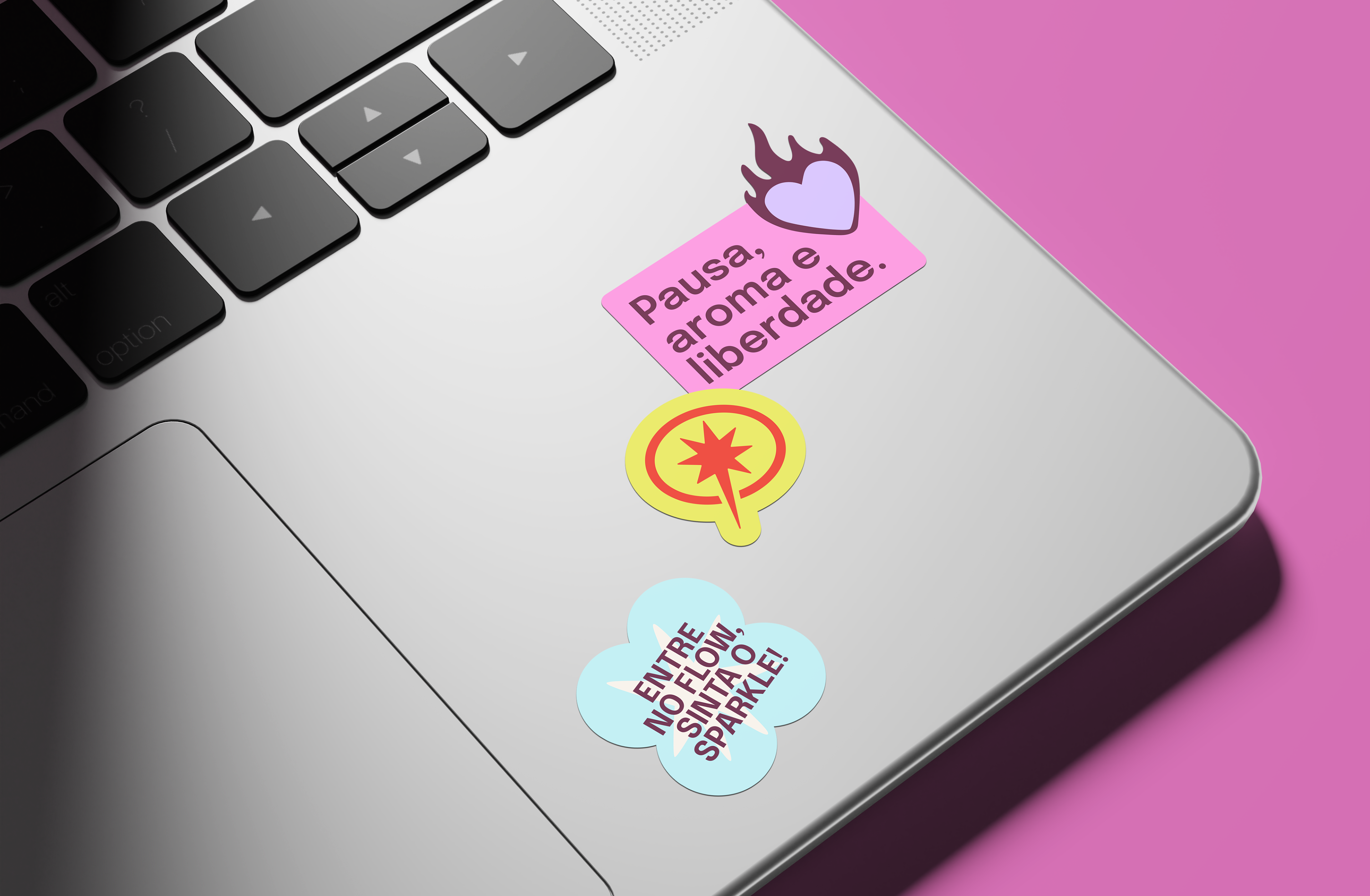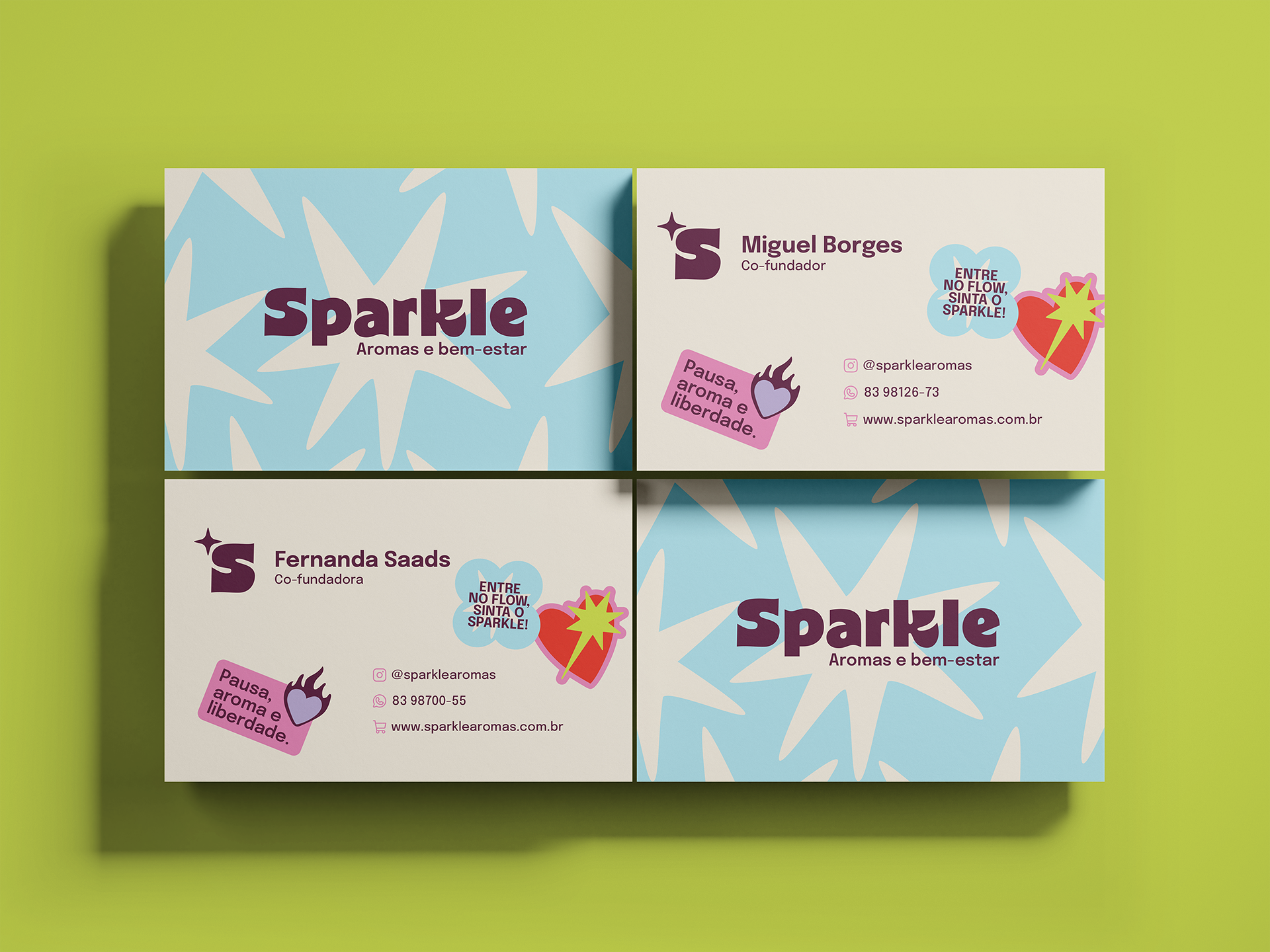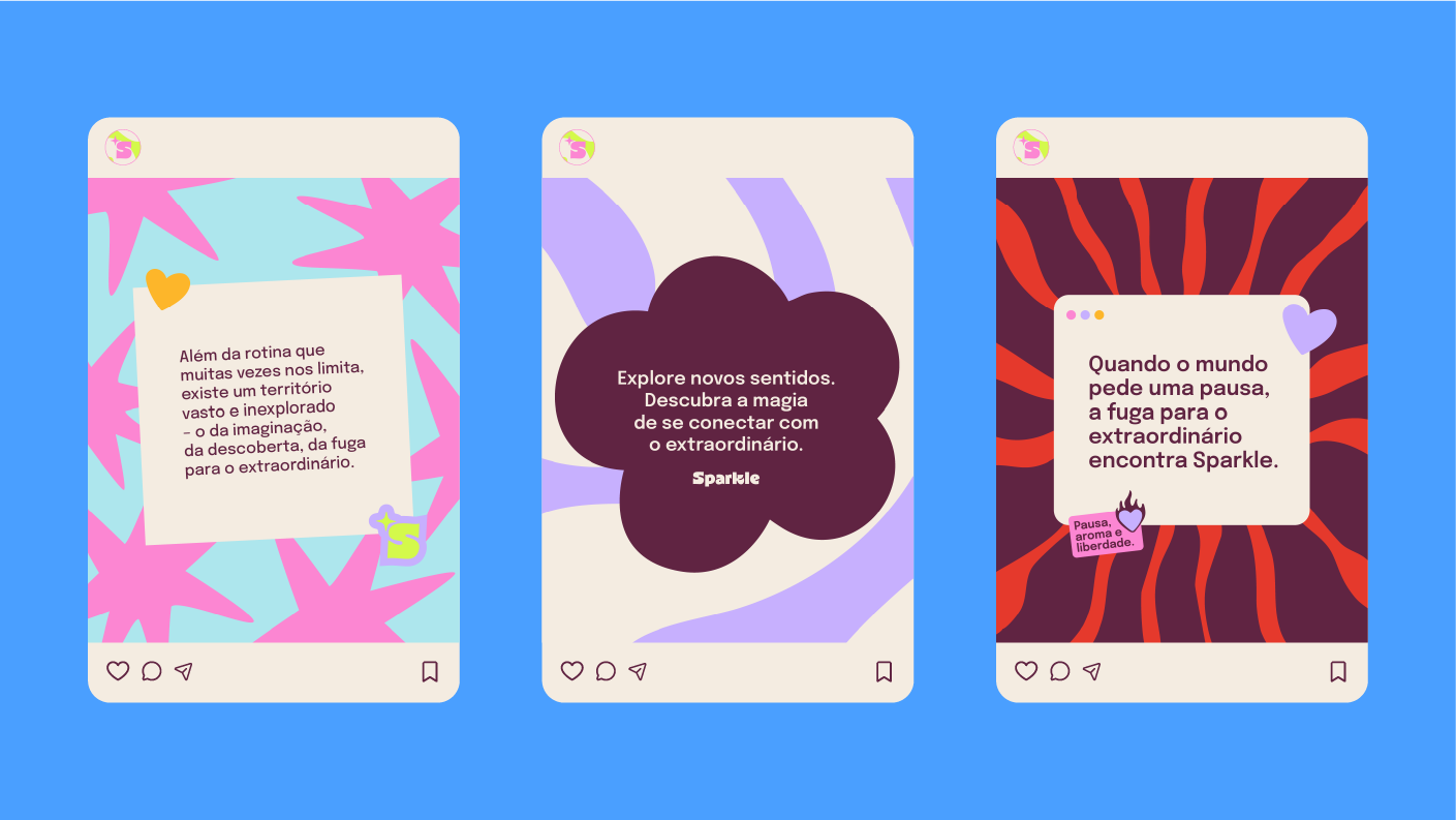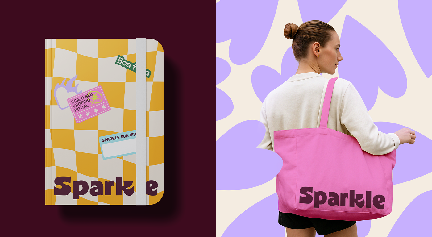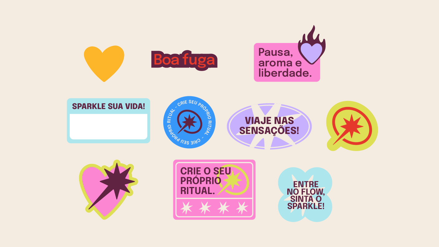 Criamos um universo de marca que traduzisse a ideia de pequenos refúgios diários. O nome “Sparkle” (que remete a brilho, encanto, faísca) representa a fagulha de bem-estar que pode transformar o dia. A assinatura “Aromas & Bem-estar” reforça o valor funcional e emocional dos produtos.